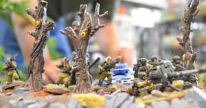 The northern advance of the Tau stops, as the commander orders up a second Devilfish with the Assault Squad—and waits for its arrival.The Imperials move up to the edge of their woods and set up a firing line.