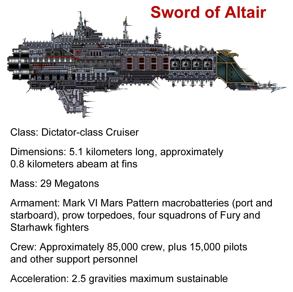 Sword of Altair (Dictator-class Cruiser)—The Sword of Altair is a rare example of an Imperial cruiser in the service of an Astartes naval fleet. The ship was seized from the insane Rogue Trader Coligulos by Chapter Master Tendoros in M39.