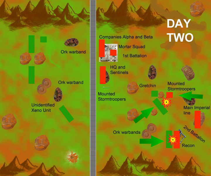 The initial ork attack to the north caught the Imperial line while the 1st and 2nd Battalions were separated and unable to support one another. (Click map for larger view.)