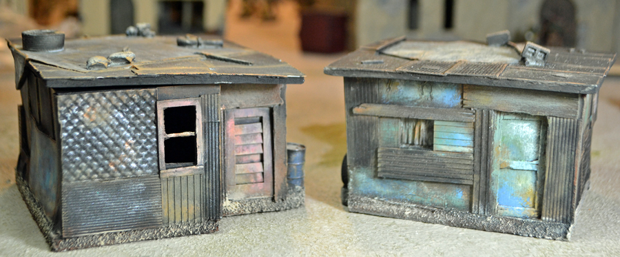 I highly recommend them. They are a good size for wargaming, and set up on a tabletop, they add a nice “squalor” to any 40K setting. Mixed with my Games Workshop buildings, I can create the outlying slums of a manufactorum or hive city–all, of course, infested with mutants and Chaos cultists.