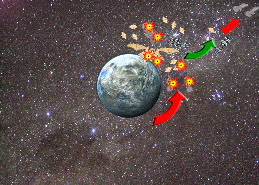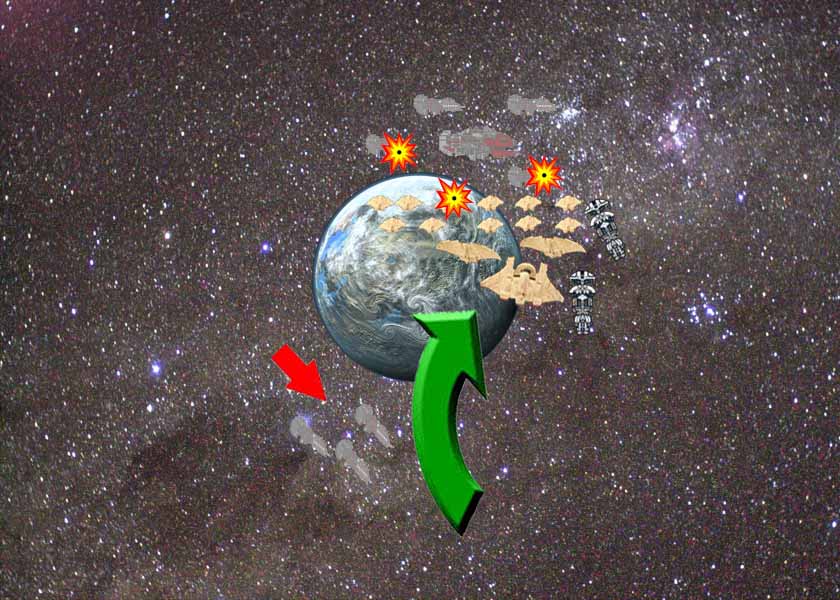 Although a difficult maneuver, this shift in trajectory served its purpose: It left the initial group of ork ships struggling to turn in response, while allowing the Tau to strike at a second conglomeration of ork ships on the opposite side of the planet—ships that were isolated and unsupported by the originally targeted ork vessels.