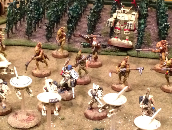 As the Tau main attack attempted to Deep Strike amidst the Imperial lines, Tau and Kroot infantry assaulted the Imperial front line. They were mowed down by sustained and disciplined volley fire.