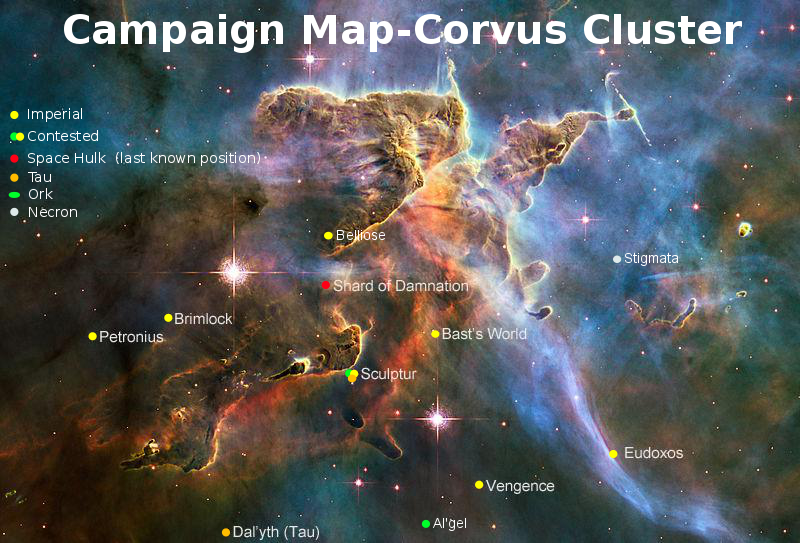 An important caveat: Neither of these campaign maps claims to provide a detailed geography of the entire Corvus Cluster. Taking a page out of Games Workshop’s thinking, it’s best not to lock down all the details of a fictional universe. This gives you flexibility to tweak things. Additional worlds are likely to appear. It might be nice if their location isn’t specified, so that—if events warrant—there’s some flexibility for the campaign to determine where a new world actually is.