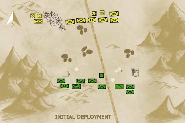 Two infantry battalions were sent up the eastern edge of the valley to seize a large ruin situated on the ork right flank. At the same time, the army commander ordered his mechanized force—the 6th Mechanized Battalion, along with his Scout Sentinels—to threaten the ork left flank.