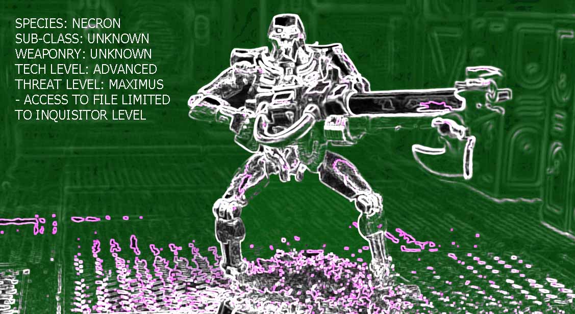 Given this data, it appears that all of these incidents are related. According to a Level 3 intelligence report by Inquisitor Dobest [original report attached, original date: 6 329 427.M41], the Eldar witch, Eldorath, warned of the threat of Stigmata and told of a race of xenos, the “Necrons,” that lay in hibernation on a number of “tomb worlds” throughout the galaxy.