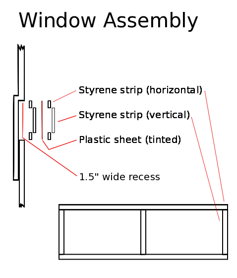 Once the paint was dry, a strip of tinted plastic sheeting was glued to the inner window frame, and then prepainted styrene strips (black) were glued over the plastic sheet to serve as the outer window casing.