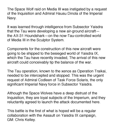 No matter. The fire warrior was dead a second after he fired, and in a blink of an eye, the Space Wolves had crossed the remaining distance to the enemy firing line. Valdar leaped skyward and landed amidst the terrified enemy. As he swept his chainsword in an arc, the screams of dying men echoed across the compound.