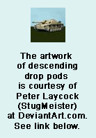 As the hatches slammed to the ground, the storm bolter above the Space Marines’ heads roared to life, spraying the surrounding ground with heavy fire. Half a dozen PDF soldiers were torn apart by heavy slugs of steel and titanium.
