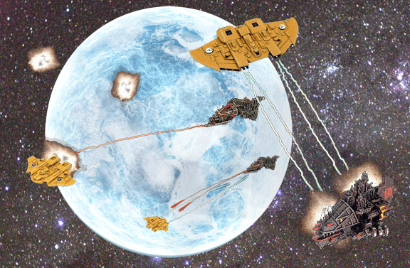 With the orks in higher orbit, Commander Dorir found his task force at a tactical disadvantage, as his ships had to accelerate against gravity, while the ork ships could use gravity to build acceleration. Unable to outmaneuver the enemy and use his superior targeting array at a distance, Dorir recognized he had no choice: he ordered his ships to turn directly at the enemy.