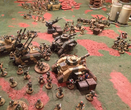 The defenses included six battalions of crack infantry, bolstered by two companies of armor, and several squadrons of Sentinels. To bolster the left flank of the line, the regular guardsmen were reinforced with a battalion of eager conscripts.