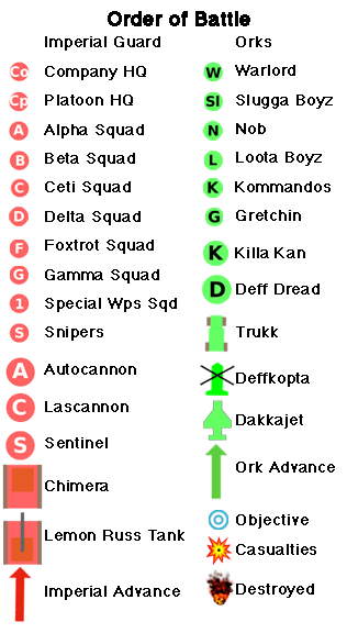 Standing atop his command Chimera, the veteran officer scanned the southern horizon through his binoculars. Adjusted to scan the infrared spectrum, his binoculars gave him an all-too-clear view of the ork Trukks advancing on his defensive line.