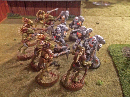 A tactical squad fo the Knights of Altair clash with a Kroot flanking force. Although the Space Marines ultimately lost the melee, xeno casualties were so great the Kroot retired from the battlefield.