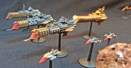 Capital ships advance on the Tau during the 2nd Naval Battle of Dar Sai. The golden capital ship is The Emperor’s Wrath where Commodore Hennard and Captain Speakeman had their influential conversation.