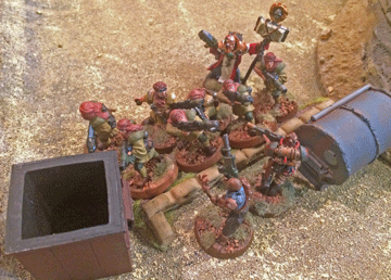 The rallied mutant squad maneuvers around the mesas and target the Skitarri that have seized the trench lines. One Skitarri is killed. The Super Mutants withdraw into the shanties to screen them from enemy fire.