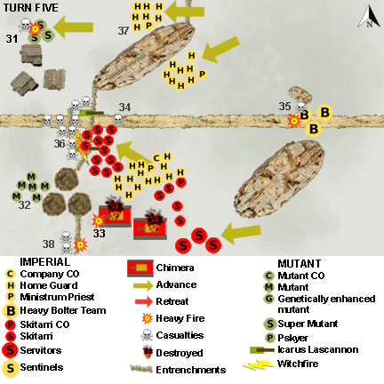 To the south, the mutants fleeing manage to rally but hide in the mesas, (32) while the remaining genetically enhanced mutants fire on the flamer-equipped Chimera and destroy it. (33) The mutant leader takes a shot and manages to kill one Imperial trooper (34), while the Icarus lascannons target the heavy bolter teams and kills one trooper. (35)