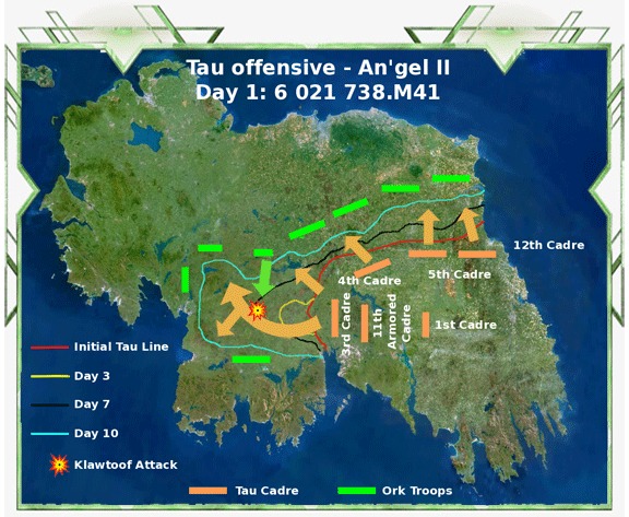 The 3rd Hunter Cadre would continue their advance for three more days before it outran its supply lines and logistical realities forced a halt to the offensive. By this point, the Tau had advanced nearly 170 kilometers and seized nearly 28,000 square kilometers of ork territory.