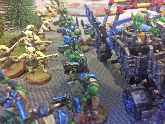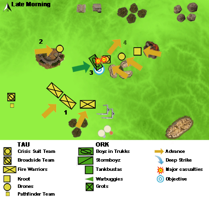 With the arrival of dawn, the ork Trukks attempted to rush the Tau firing line. Some Trukks were slowed by rough terrain, but others manged to unload their greenskin warriors in front of the thin line of fire warriors.