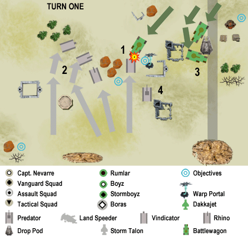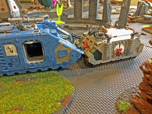 The xenos put these heavily armored vehicles to good use. One Battlewagon races down the center route and rams one Rhino, immobilizing the Space Marine transport and causing a glancing hit. (1)