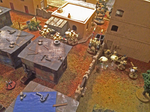 A long time ago,on the desert world of Morkai, I ran a Rogue Trader game pitting my hero, Adeon Drake, against his arch-nemesis, Count Feracci (Ambush on Morkai), I put down a bunch of MBA buildings on a desert-colored terrain mat, and I included some of MBA’s wonderful Shanty Town buildings (perfect for the slums outside a hive city).