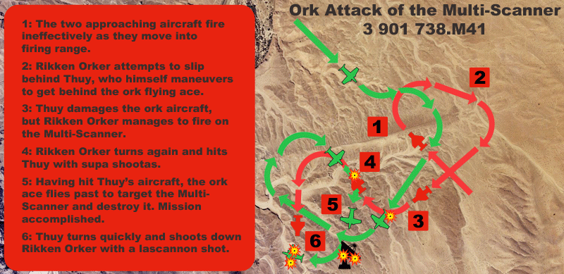 Once again, Thuy found himself confronted with the familiar sight of a red Dakkajet. Intercepting the ork aircraft before it reached the Multi-Scanner, the two aircraft exchanged ineffective fire before the xenophobic banked away from the exchange.