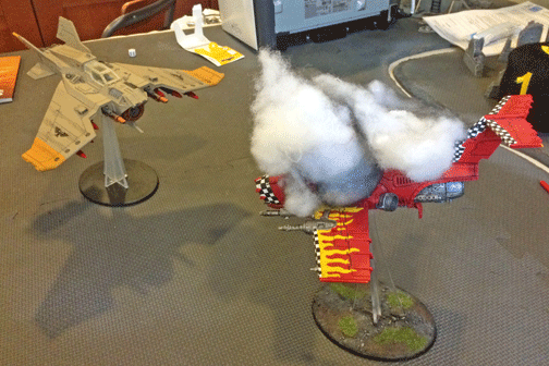 But Thuy was not far behind. After conducting a high-speed turn (a maneuver called a “wingover”), he managed to target Rikken Orker from the flank and pepper the ork’s aircraft with lascannon fire, shooting off one wing and sending the Dakkajet into a death spiral.