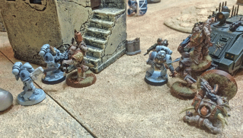 Over the next few seconds, the battle becomes a series of isolated, confused melees. Some Space Wolves trade fire with the traitor on the stairs, but then he surprises them by charging them! Other Wolves attempt to overwhelm the cultist on the street, who is reinforced by another Death Guard warrior who runs around the far side of the Rhino.