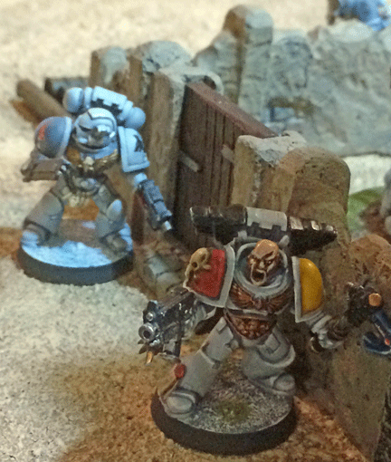 The Space Wolves’ fire team to the north of the village stealthily approach the traitors, using the stone wall to conceal their approach. They do not run, as they fear the Death Guard, with the enhanced hearing of all Astartes, might be alerted.