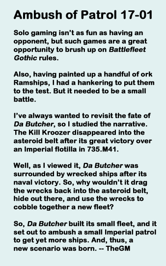 Patrol 17-01 is ambushed by ork ships appearing out of a nearby asteroid belt.