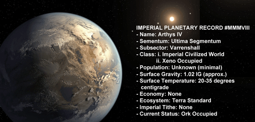 Within four months, ork warships moved deeper into the system, attacked Arthys IV’s orbital defense platforms, and blockaded the world as the greenskins overwhelmed all other pockets of resistance in the system.