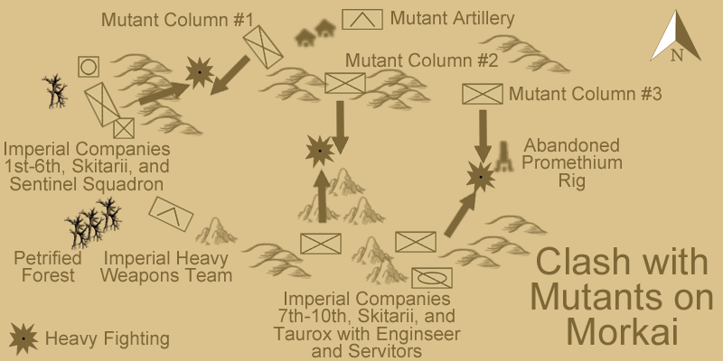 The only serious threat to the 1st Battalion developed on the east flank, where a mutant column managed to advance within 100 meters of Imperial lines and threatened to turn its flank.