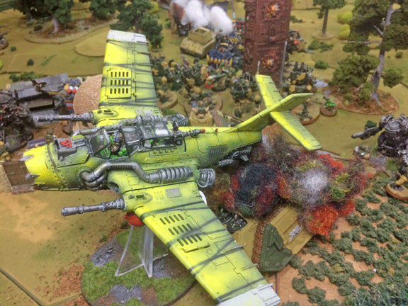 An ork “bomma” proved devastating in its attack. Strafing runs killed scores of inantry, and a dive-bombing run destroyed a key component of the Imperial defense: a Hellhound tank.