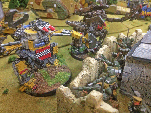 With the Sentinels destroyed, and the flanks being “rolled up” by walkers, the 1st Battalion finally broke as a second wave of walkers struck the infantry firing line at the field’s edge. Lasgun fire proved ineffective against the walkers’ armor, and all Imperial anti-tank support was targeted by an arriving ork “Blitza-Bommer” that also managed to destroy a Hellhound tank with an accurate drop of anti-tank munitions.