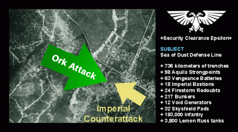 More alarming, some Imperial officers are saying unofficially that any breakthrough in the Imperial lines, particularly by a moderate-sized enemy force, suggests the defenses remain vulnerable to a larger, all-out ork attack.