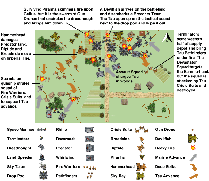While some Crisis Suits targeted the Imperial armor with mixed success, a squad of Crisis Suits armed with burst cannon surprised a Devastator Squad and slaughtered it.