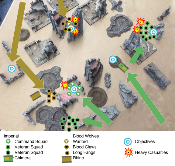 Imperial Victory Points: Three objectives of varying value (7 v.p.), First Blood (1 v.p.), and Slay the Warlord (1 v.p.) = 9 v.p.