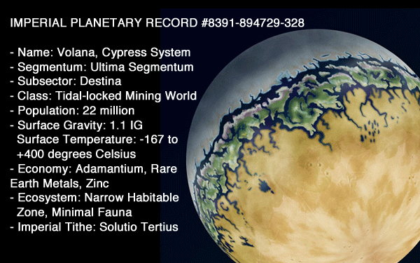 Approximately 22 million Imperial citizens live on Volana. Approximately 5 million reside in the planet’s two largest industrial areas: the capital city of Fierro and the mining complex of Nightvale.