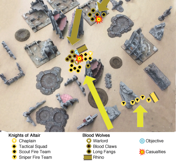 That would allow me to charge with the scouts and chaplain. It just “saw it.” The dice were average, but not cruel, and although I lost the tactical squad, I ended the melee with the Relic in loyalist hands. With a few dead Long Fangs caused by my snipers, the Blood Wolves had to flee.