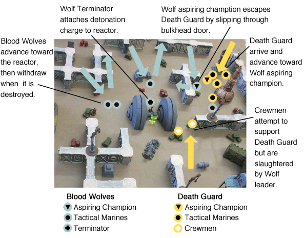 The Death Guard respond to the attack by seeking to corner the Wolves’ aspiring champion, seen in the lower left corner.