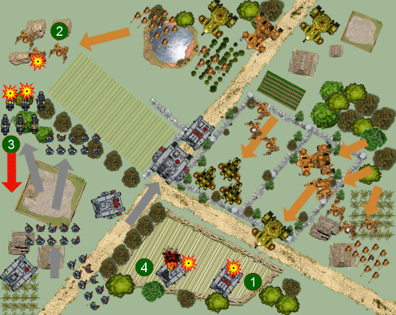 The Tau warlord, along with bodyguard, as well as a second Hammerhead armed with an ion cannon, also advance cautiously into the fields. The xeno tank fails in its long-range shot against the Vindicator.