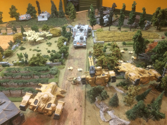 At the end of the road in the center of the table is an apple orchard, where a Hammerhead tank, commanded by Longstrike, takes aim at a Rhino that obviously is going to rush up the road. If the transport can be stopped, the Land Raider behind it (the bigger threat) will have to go off-road, and the Tau commander will laugh with glee if it bogs down because of a difficult terrain roll.