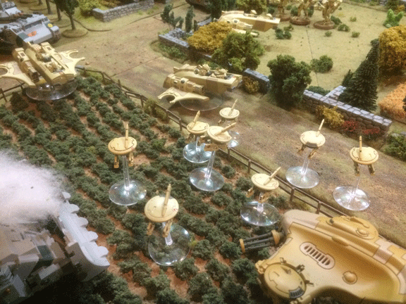 Gun drones infest a crop field on the Imperial right flank. A series of volleys by nearby Space Marine, however, destroy the threat.