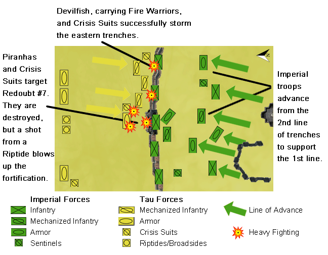 A Tau Breacher Team seizes the western trenches and sets up a firing line, determined to hold the position against the eventual Imperial counterattack.