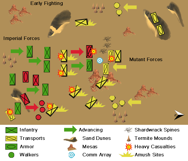 Thus battle was joined. The communications array was situated to the west of a series of limestone mesas, with the surrounding region dotted with sand dunes, scattered rock formations, and Shardwrack Spines. As the Imperials marched north to meet the threat, the mutant vehicles hurried south, as if in a race for control of the array.