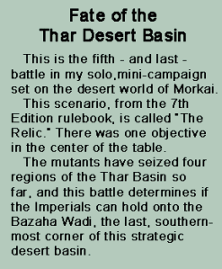 Having withdraw from the Azari Oasis, the Home Guard was challenged almost immediately after taking up a position in the Bazaha Wadi, the last Imperial-held region of the Thar Desert Basin. A vanguard of Skitarii, supported by a screen of PDF troops, were deployed south of a communications array built by the ill-fated 17th PDF Battalion some weeks earlier.