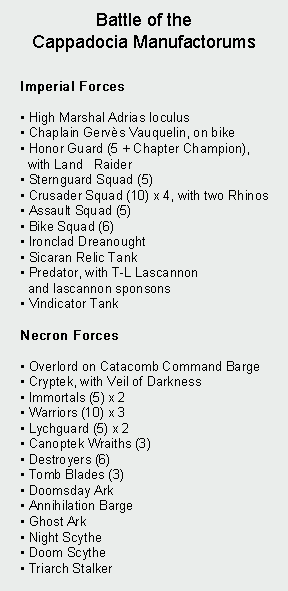 On 6 028 741.M41, the Knights of Altair launched their first attack against the Necrons, smashing directly into the vanguard of a new xeno advance on the critical Cappadocia Manufacturums