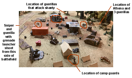 Lecia and three guerillas were to the south of the camp, hidden in the woods. A sniper and spotter were to the north of the camp, while a guerilla with a grenade launcher waited to the northeast. On the east side of the camp, three guerillas waited, ready to storm the shanty.