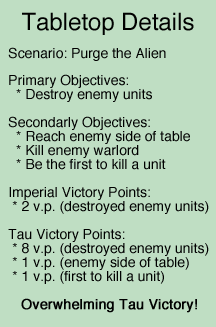 Tau weaponry dominated the battlefield. An aerial drop of Tau crisis suits (left top) devastated the 11th PDF Regiment, which suffered 90 percent casualties. The arrival of more Crisis Suits amidst the 3rd Armored Battalion forced the Imperial command to call off their planned flank attack. In the center, powerful shelling by Riptide battle suits and Barracuda aircraft stopped cold the 14th PDF Regiment.