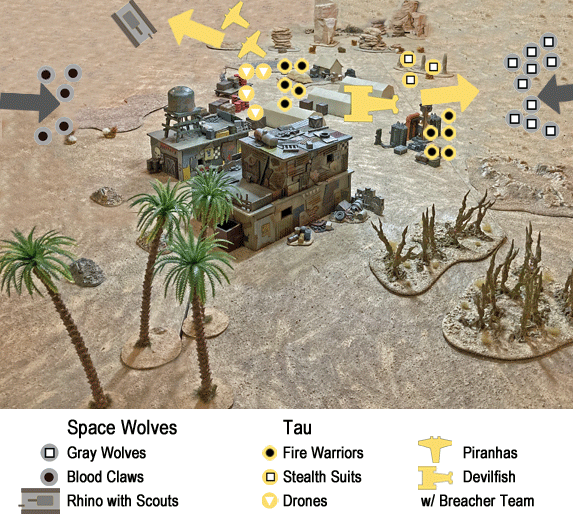 The Wolves divided their forces and attacked from the north and south of the Tau camp. For simplicity’s sake, I have taken the liberty of foregoing an entirely chronological description of the battle and, instead, will focus on each attack force separately.