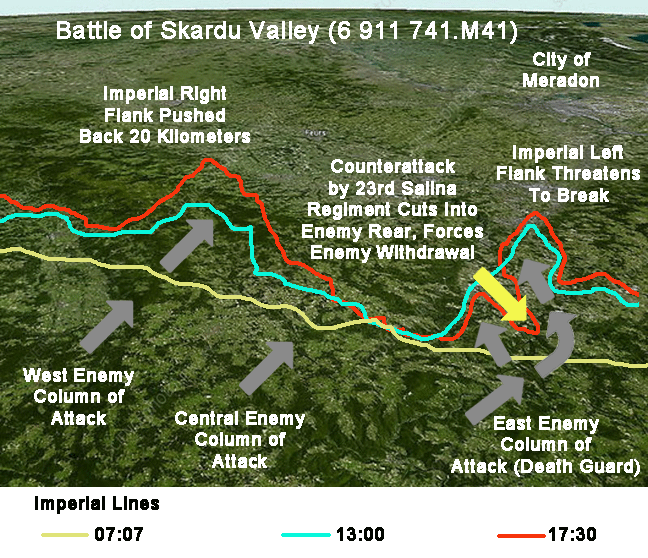 Although military officials have yet to describe the battle in detail, what is known is that the enemy attacked in three columns. Approximately 30,000 cultists and more disciplined traitor troops advanced on foot up the middle of the valley. Another 20,000 enemy troops, using trucks and mechanized armor to speed their advance, moved up the western side of the valley.