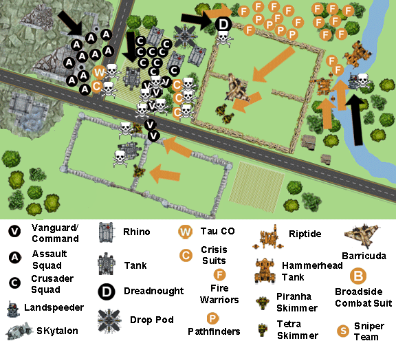 But they try: The remaining armor, the Crusader Squads, and the Assault Squads race forward to support the dreadnought’s reckless chase of the Fire Warriors. Perhaps the Tau flank still can be turned.
